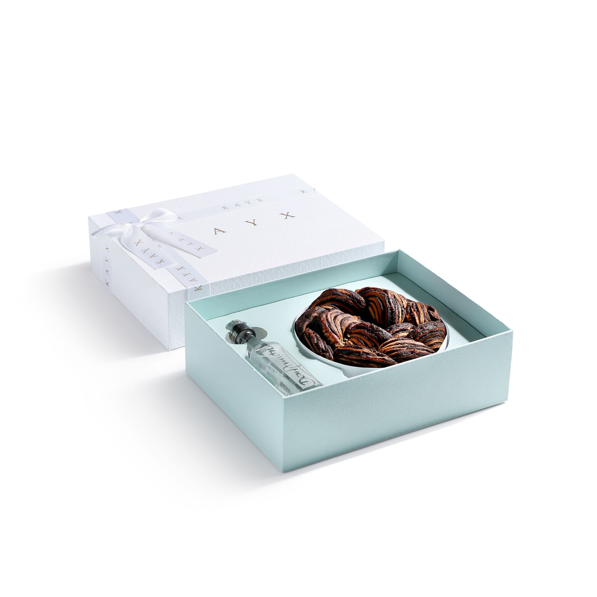 One 6″ round chocolate babka and a tequila liquor in an embossed signature kayx gift box.